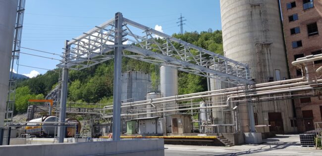 Zurück zur Referenzseite Rohrbrücke zu Neubau Tanklager West Kunde: Ems-Chemie Objekt: Rohbrücke zu Neubau Tanklager West Herstellung: Mai 2019 Gewicht: 12.63 to